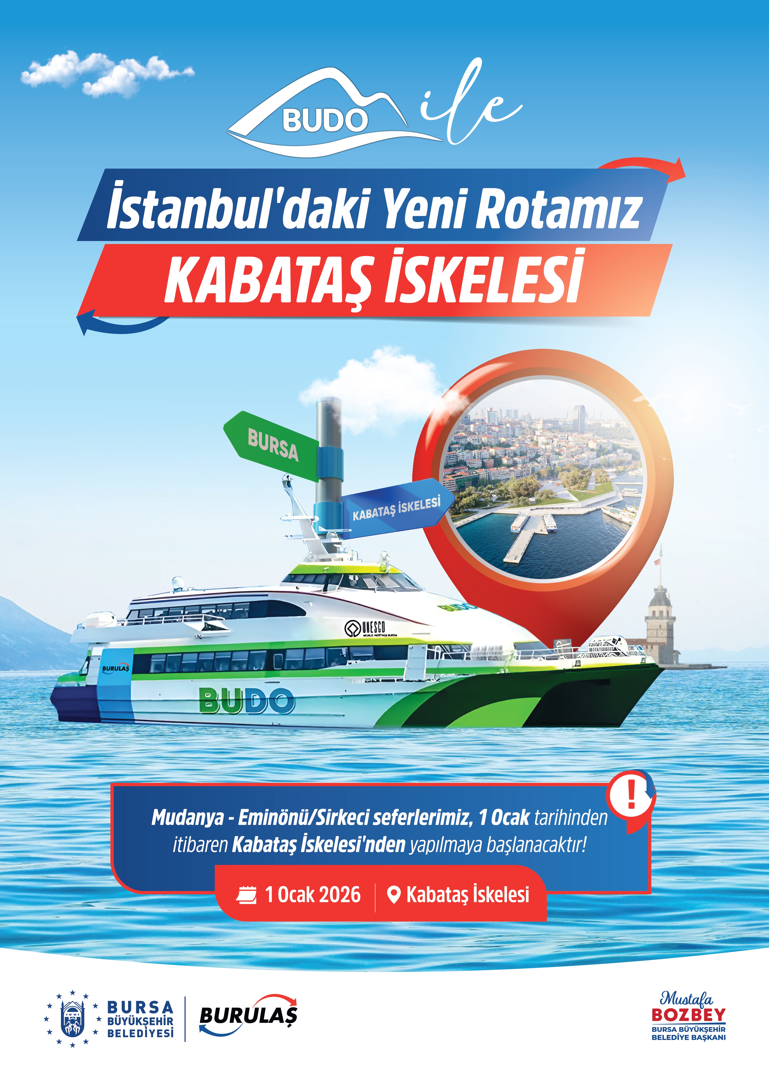 1 Ocak 2026 Perşembe gününden itibaren yeni uygulamayla birlikte BUDO’nun tüm İstanbul seferlerinin Kabataş Transfer Merkezi’nden gerçekleştirileceğini söyleyen Başkan Mustafa Bozbey, yolcuların bu tarihten sonraki seyahat planlamalarını söz konusu değişikliği dikkate alarak yapmalarını istedi.