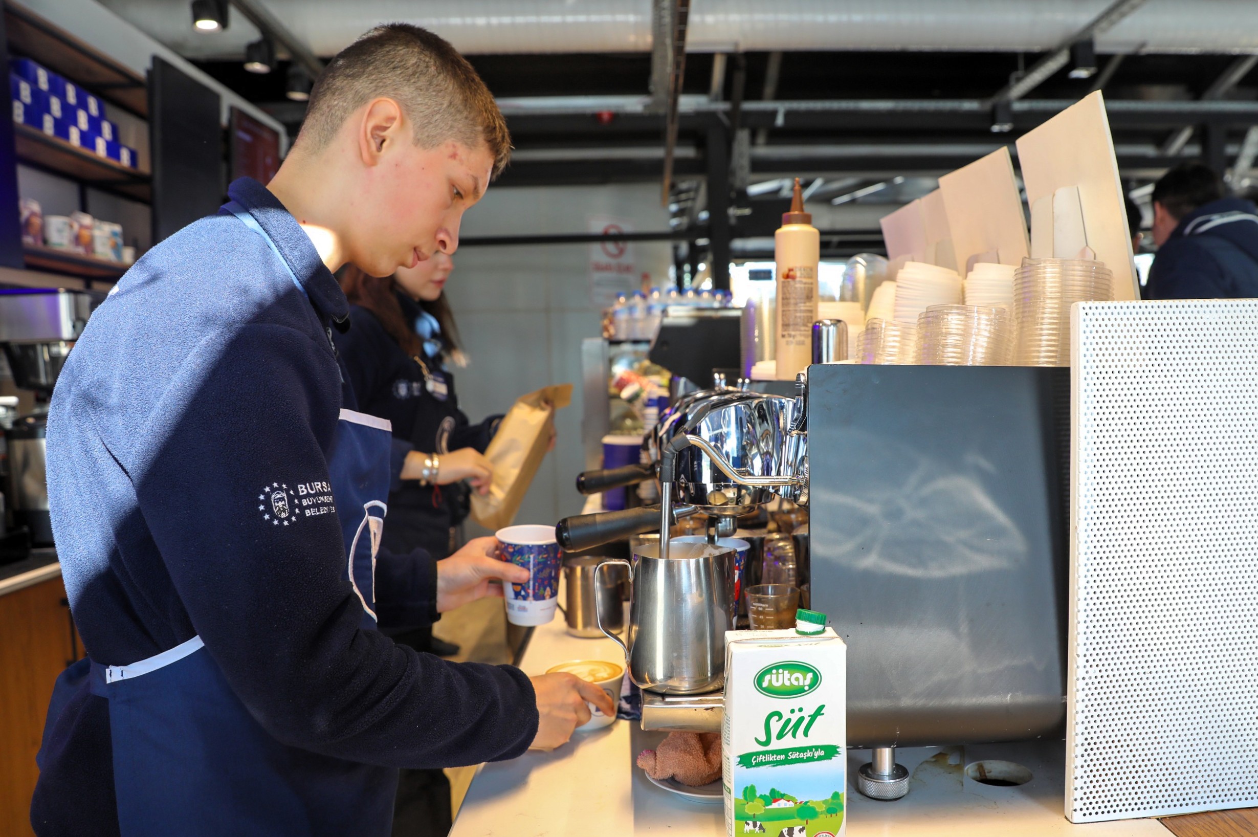 Merinos Parkı’ndaki BURFAŞ B Kafe’de stajyer barista olarak görev yapan 16 yaşındaki Ümit Hazar, barista önlüğünü giyerek personelle birlikte siparişleri titizlikle hazırlıyor.