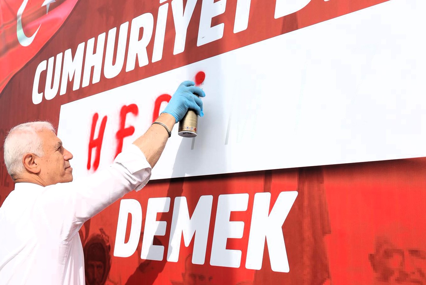 Kampanyaya ‘Cumhuriyet demek, hepimiz demek’ diyerek katılan Bursa Büyükşehir Belediye Başkanı Mustafa Bozbey de sloganını billboarda sprey boyayla yazdı.