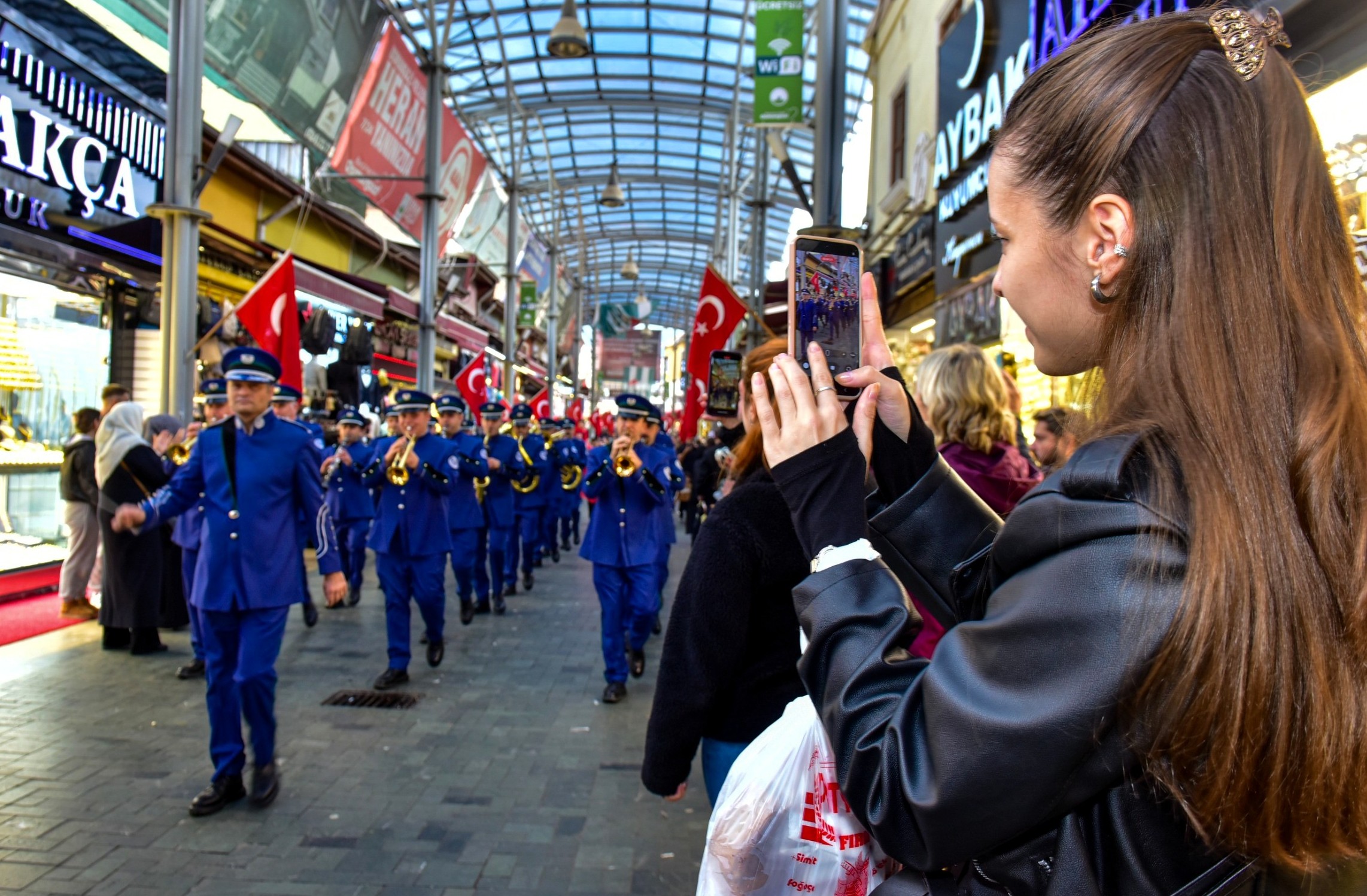 Tarihi Hanlar Bölgesi’ndeki çarşılarda marşlar ve kahramanlık ezgileri seslendiren Büyükşehir Belediyesi Bandosu, esnaf ve vatandaşlar tarafından karşılandı.