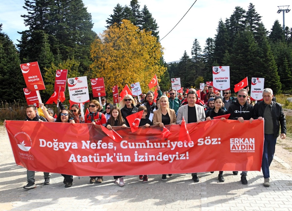 Osmangazi Belediyesi’nin düzenlediği “Doğanın İçinde Cumhuriyetin İzinde” yürüyüşüne katılan 250 kişilik Cumhuriyet sevdalısı Uludağ Çobankaya mevkiinden başlayarak Sarıalana kadar ellerinde Türk Bayraklarıyla 4 kilometrelik parkurda 10’uncu Yıl Marşı eşliğinde ilerledi.