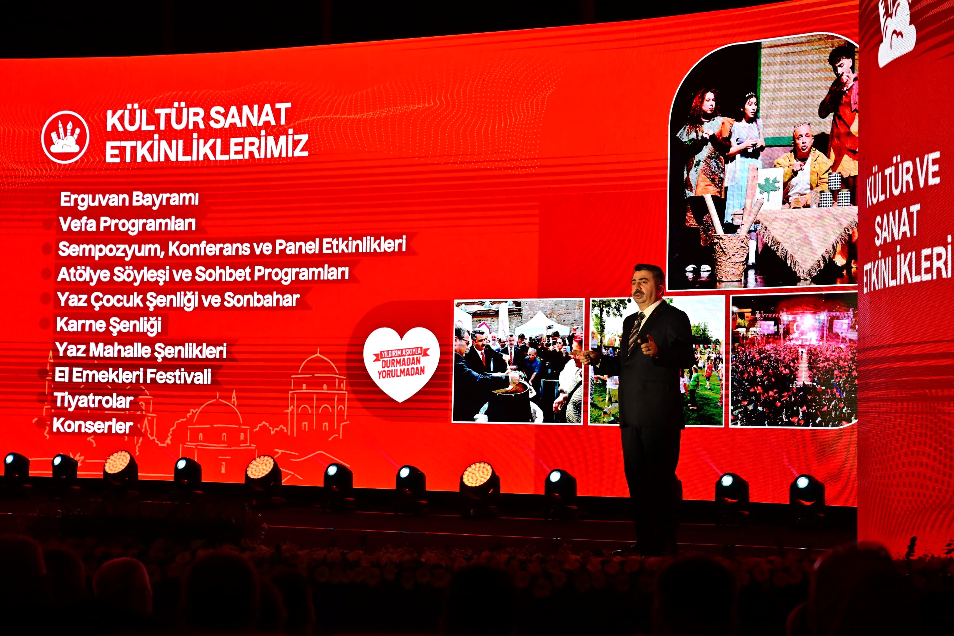 Kentsel dönüşümden imar planlarına, ulaşımdan sosyal ve kültürel projelere, gençlik yatırımlarından çevre ve enerji hamlelerine kadar geniş bir yelpazede yapılan çalışmaları rakamlarla aktaran Başkan Yılmaz, ikinci dönem vizyonuna ilişkin hedeflerini de açıkladı.