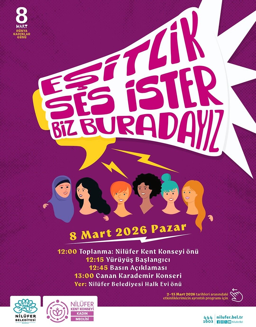 “Eşitlik Ses İster Biz Buradayız” sloganıyla hazırlanan etkinlikler, 2 – 8 Mart tarihleri arasında kentin dört bir yanında Nilüferlilerle buluşacak.