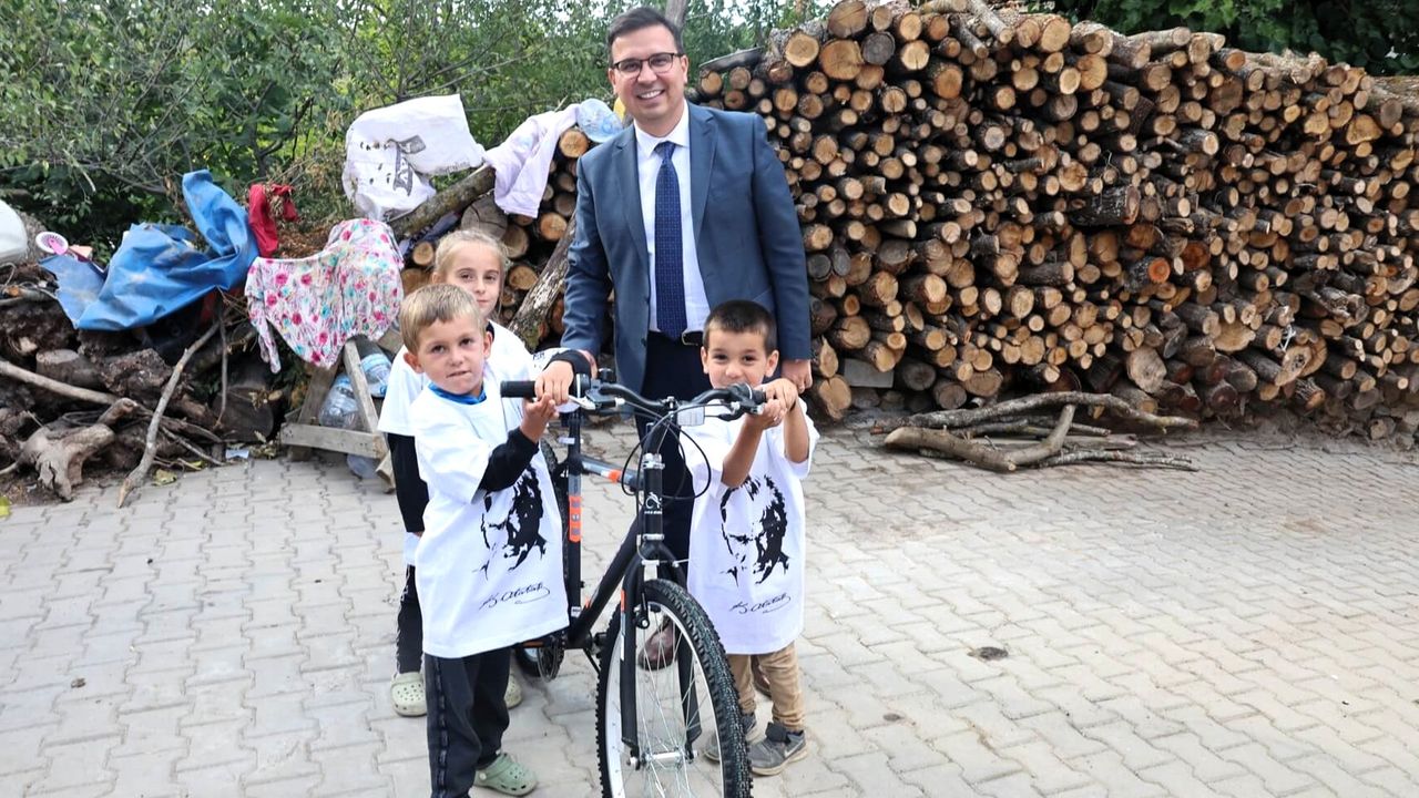 Şahin, bisikletin yanı sıra yanında getirdiği Atatürk baskılı tişörtü ve futbol topunu da Hamza ve arkadaşlarına hediye etti.