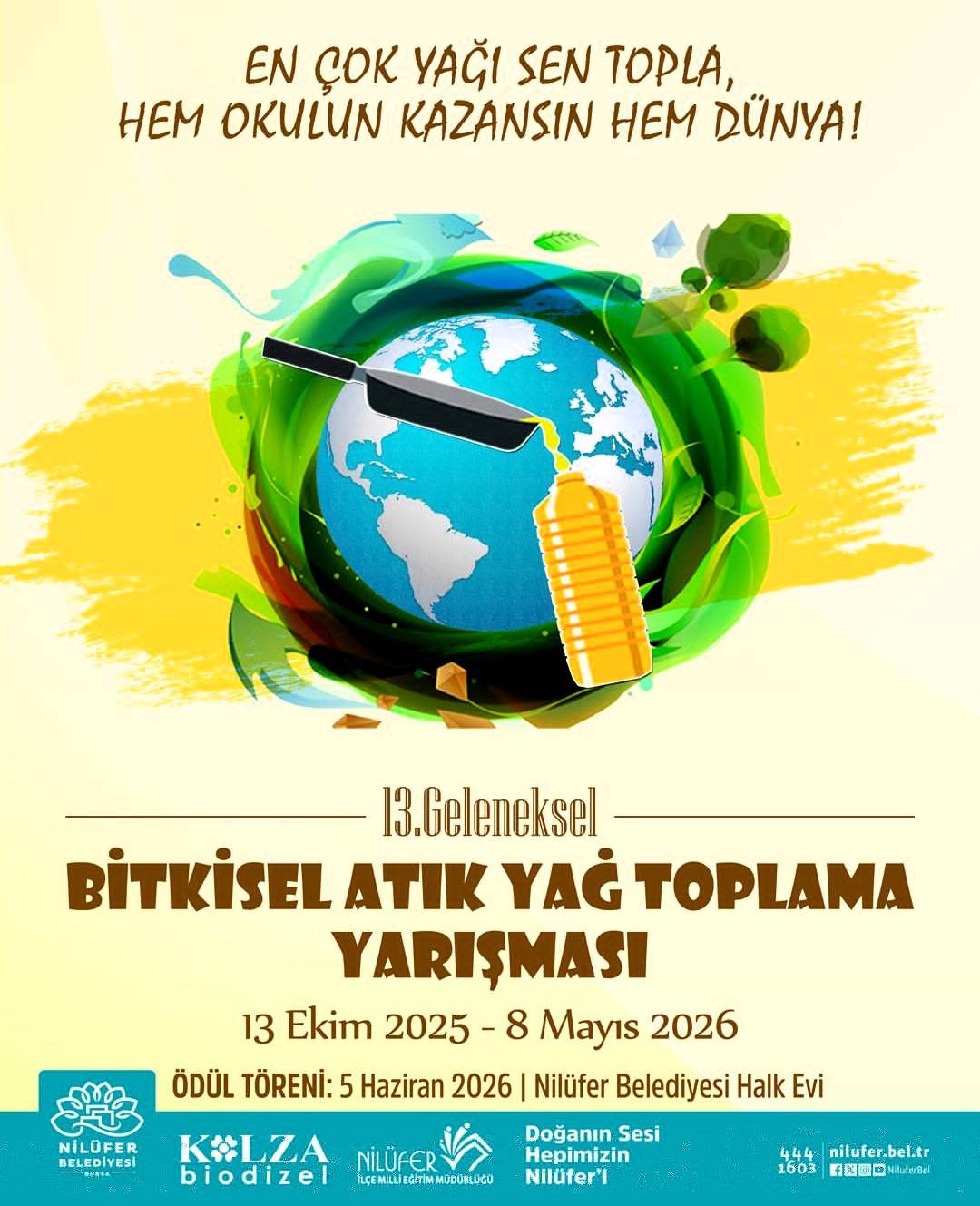 Nilüfer Belediyesi’nin, Nilüfer İlçe Milli Eğitim Müdürlüğü ve lisanslı toplayıcı firma KOLZA Biodizel iş birliğiyle hayata geçirdiği Geleneksel Bitkisel Atık Yağ Toplama Yarışması, ilçedeki tüm ilköğretim okulları ve liseleri kapsayacak.