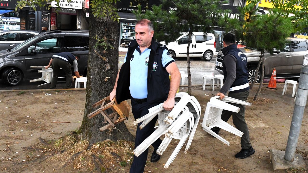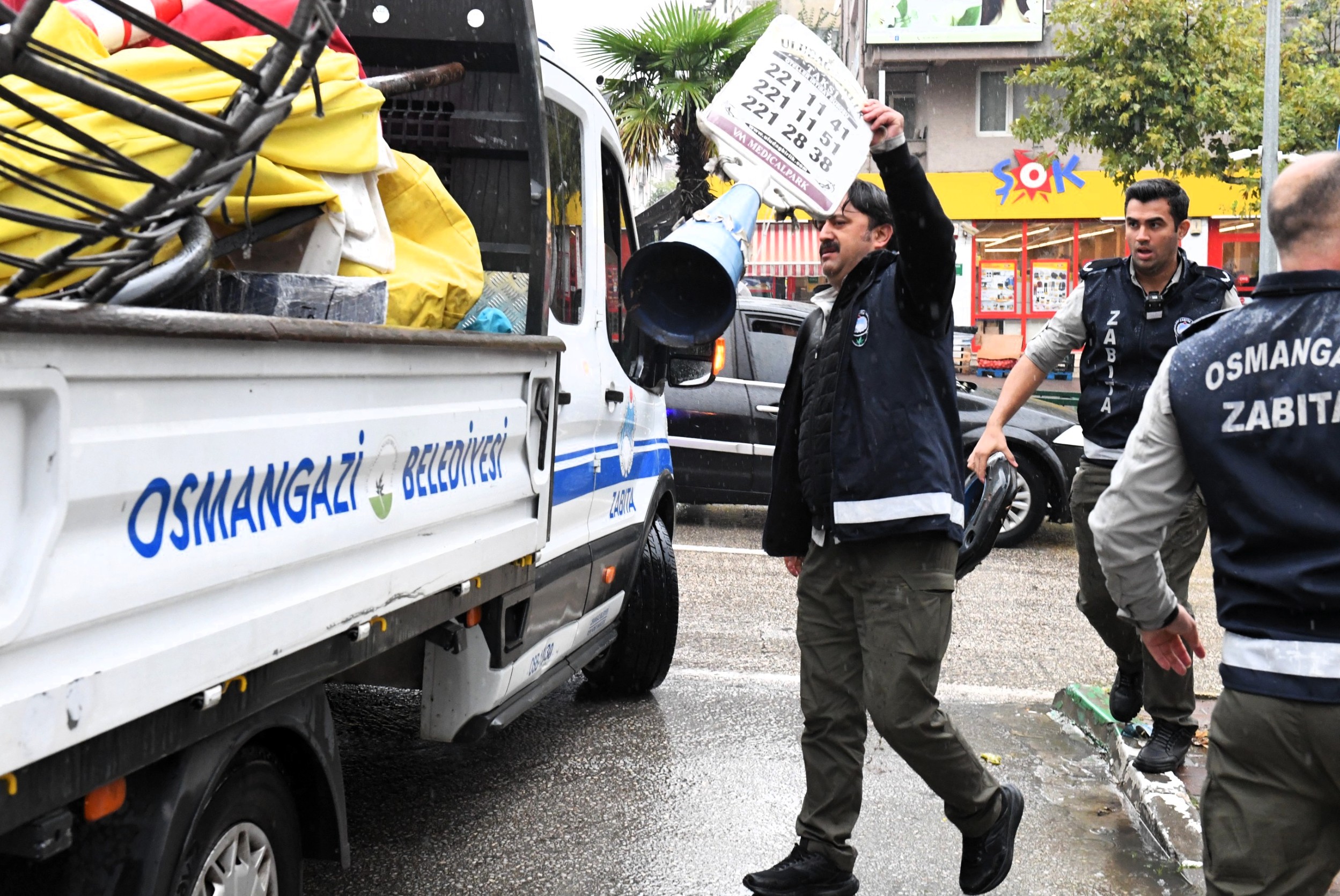 Osmangazi Belediyesi zabıta ekipleri yayaların kullanımı için ayrılan kaldırımlara masa, sandalye, şemsiye ile araç parkını engelleyen duba ve reklam amaçlı flamalar koyan işletmelerin eşyalarını toplayarak cezai işlem uyguladı.