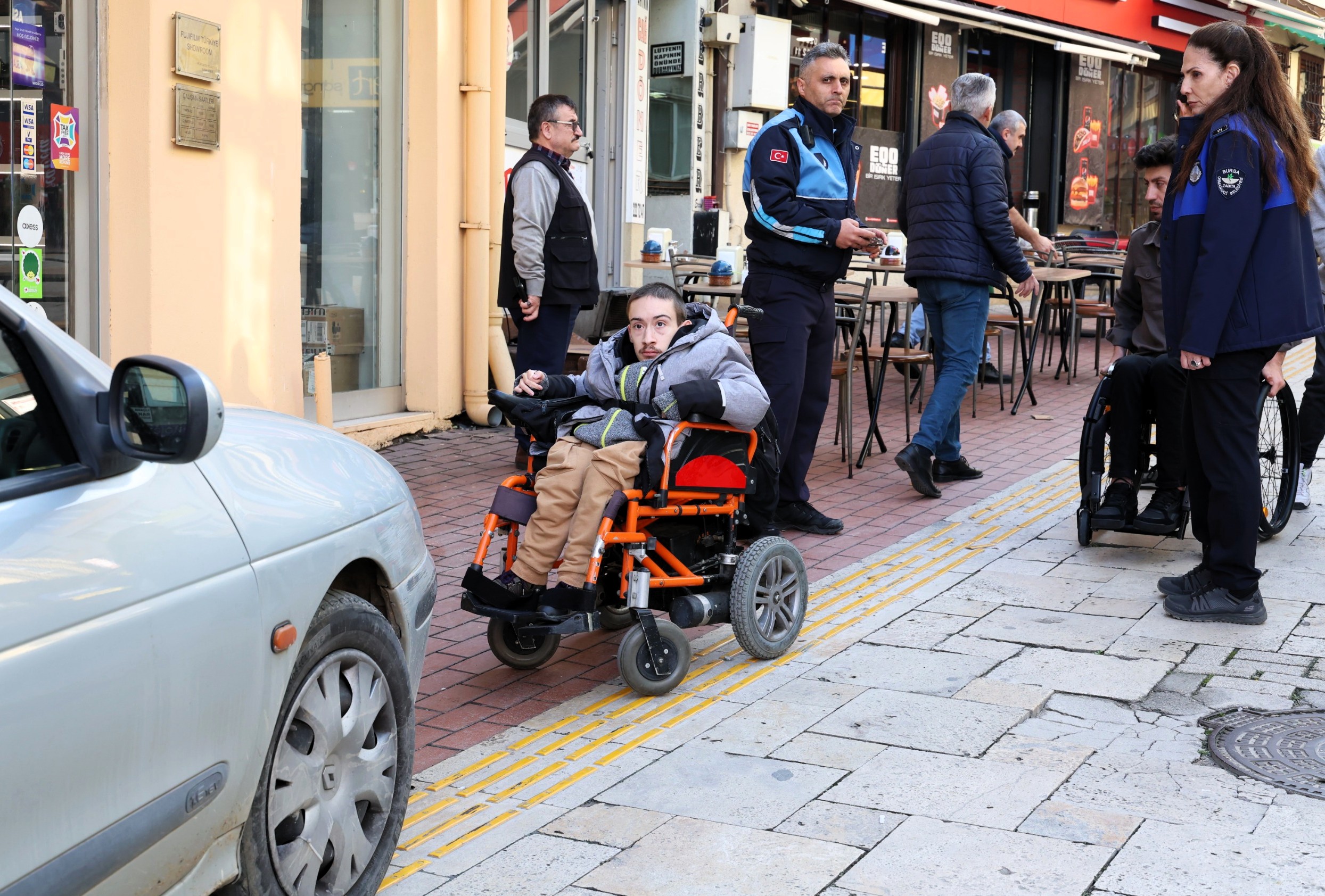 Denetim sırasında engelli bireylerin yaya yollarında rahatça ilerleyebilmesi için zabıta ekipleri onlara eşlik etti.
