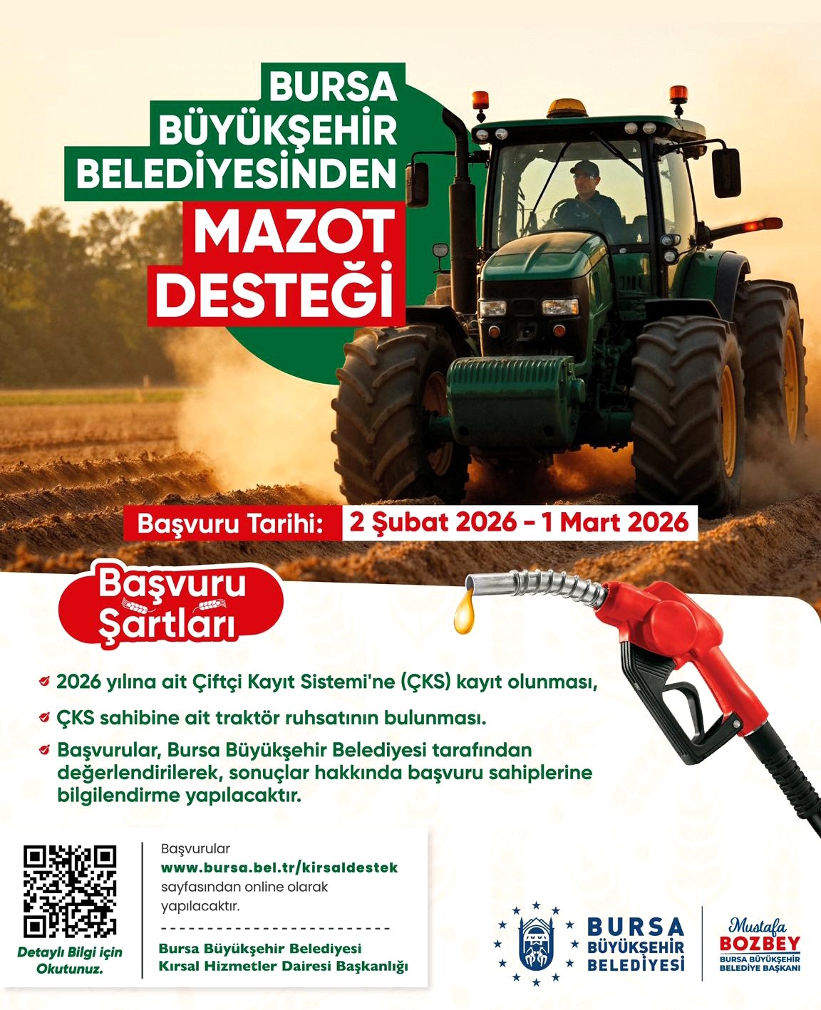 Büyükşehir Belediyesi, 2 Şubat Salı günü itibarıyla mazotla ilgili talepleri almaya başladı. Başvurular, 1 Mart 2026 tarihine kadar www.bursa.bel.tr/kirsaldestek sayfasından yapılabilecek.